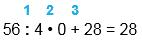 1) 56 : 4 = 40 : 4 + 1 : 4 = 14 2) 14 • 0 = 0 3) 0 + 28 = 28 |